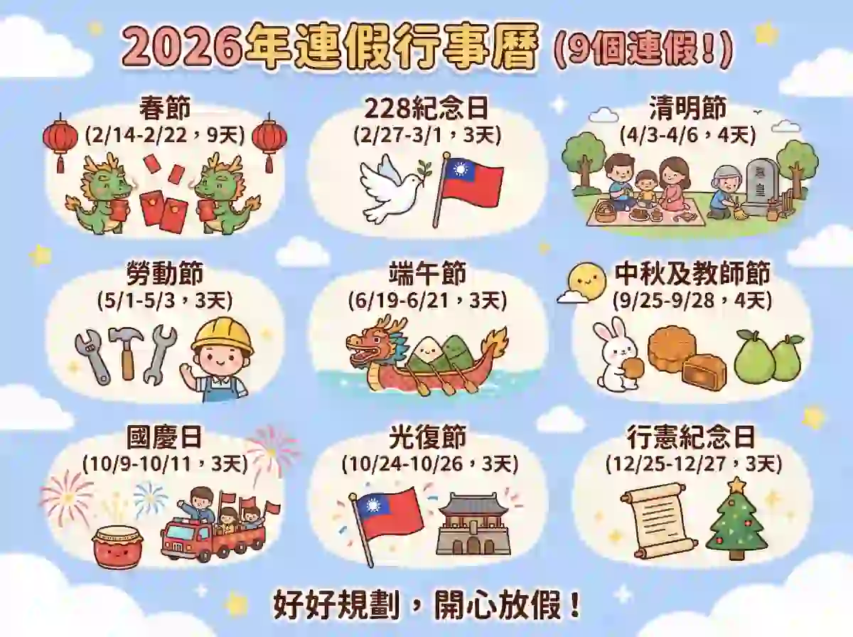 生活隨筆2021年行事曆與連假行程安排 2021年共有8個連續假期,其中包含一個農曆春節的七天連假、兩個四天連假、以及五個三天連假(人事行政局官網公告連結)。 另外寒暑假為: 寒假:01.21~02.10(尚未正式公佈) 暑假:07.01~08.29(尚未正式公… sya2020-06-01