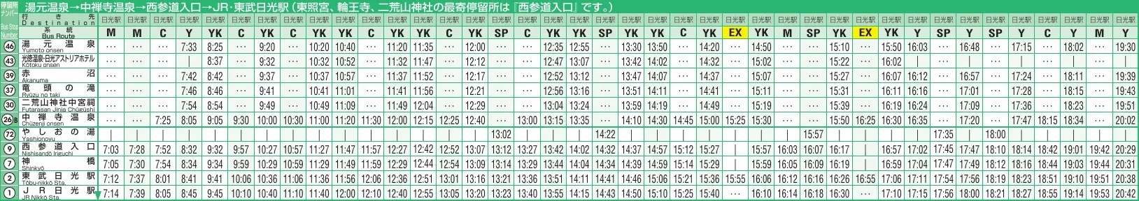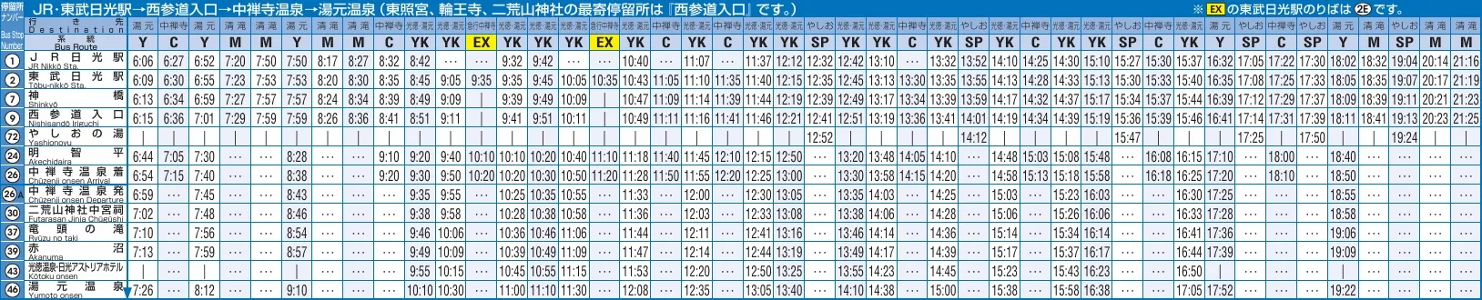 | EX | 中禪寺湖 | 終站為中禪寺湖,停的站點少 |